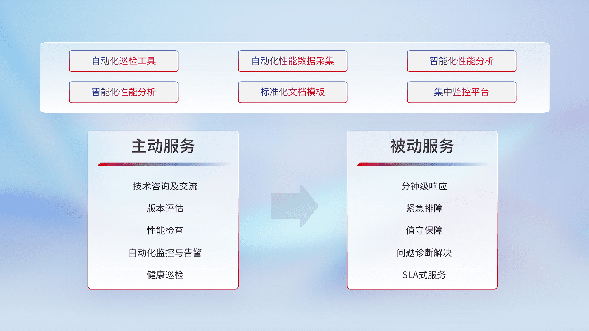 智能化工具和标准化文档,,,保障服务质量,,,提供主动服务(包含技术咨询、、版本评估、、性能检查、、、自动化监控与告警、、、、健康巡检)和被动服务包含(分钟级响应、、紧急排障、、、、值守保障、、、、问题诊断解决、、、、SLA服务)。。。。