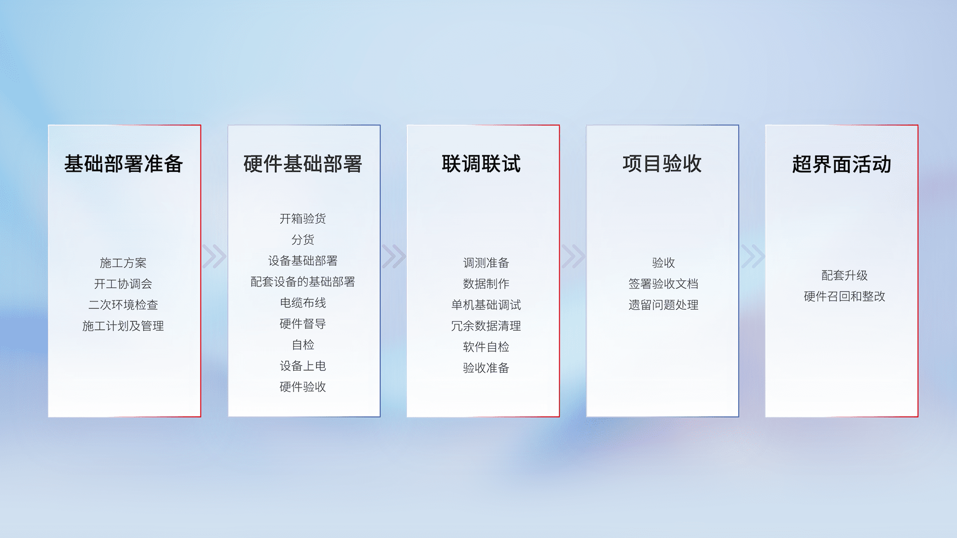 从基础部署准备、、硬件基础部署、、联调联试、、项目验收、、越界面活动的全过程可追溯,,,,保证施工质量和进度。。。。